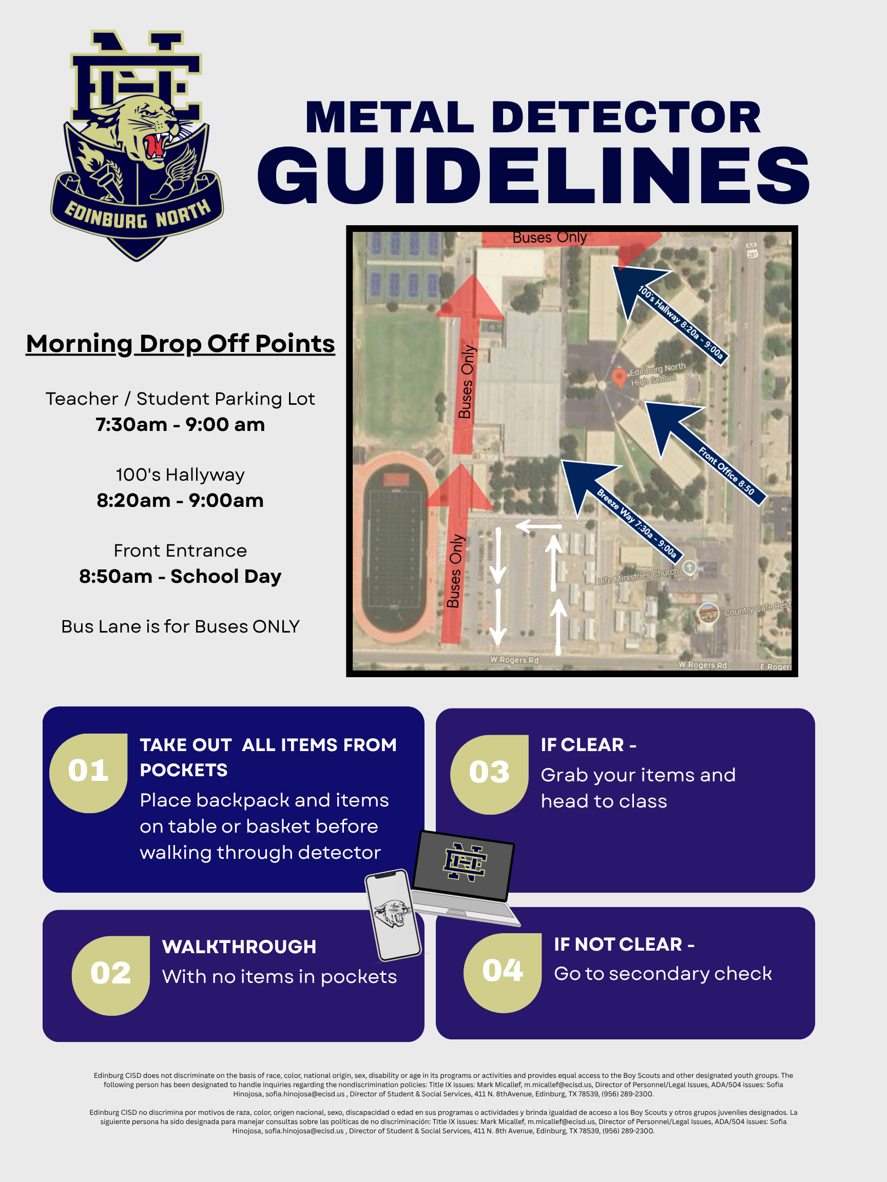 To ensure a safe and secure learning environment, Edinburg North High School has implemented updated metal detector procedures for all students entering campus. These guidelines are designed to streamline the morning entry process while maintaining the highest standards of safety.